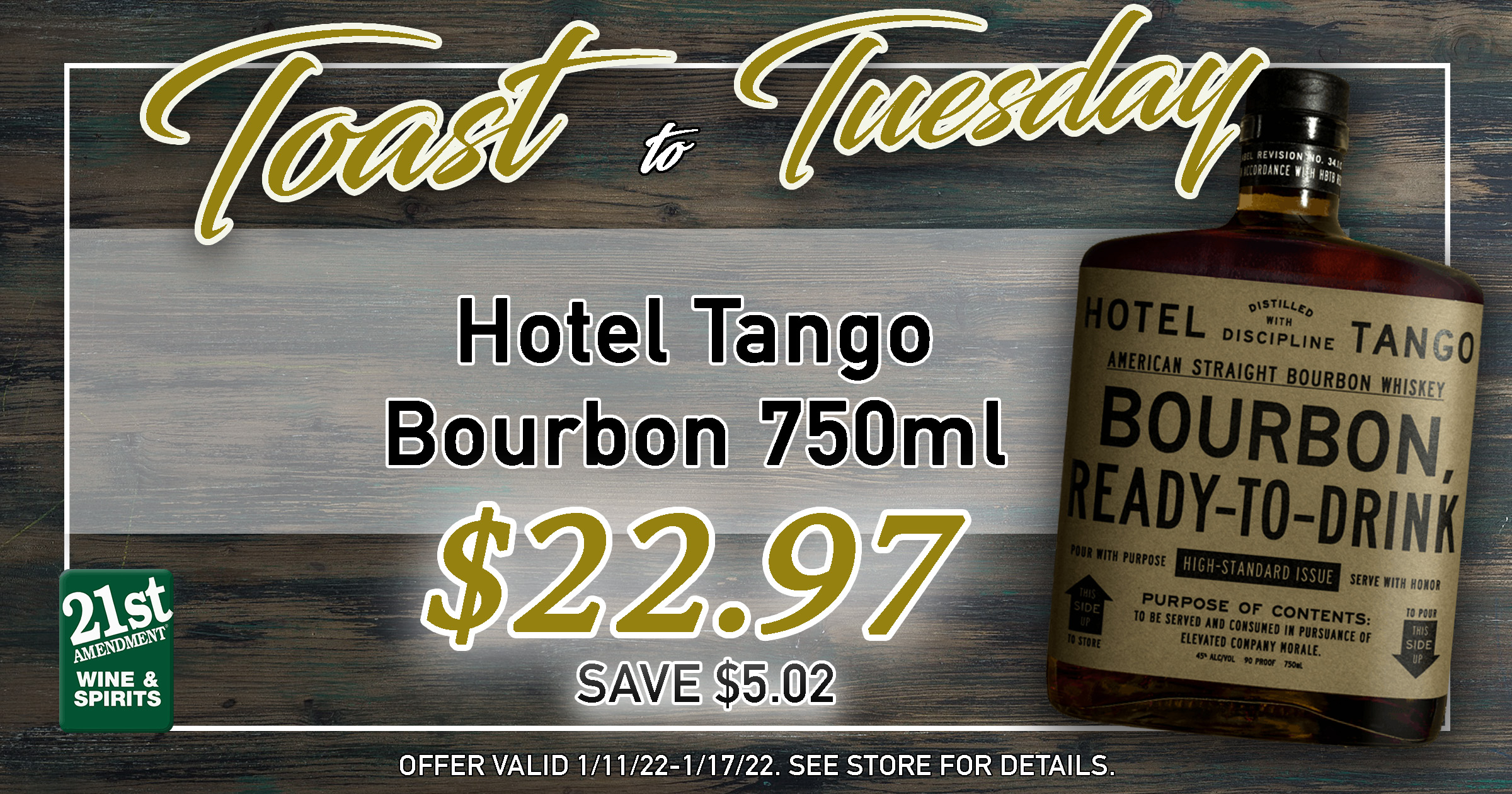 Hotel Tango American Straight Bourbon Spirits Distilled with Discipline Size. HT Distillery Detailed Description How its made bravo bourbon is made with choice wheat and corn aged in new medium-char oak barrels and proofed to 90 for smooth easy drinking. Complimentary shipping on 3 bottles.